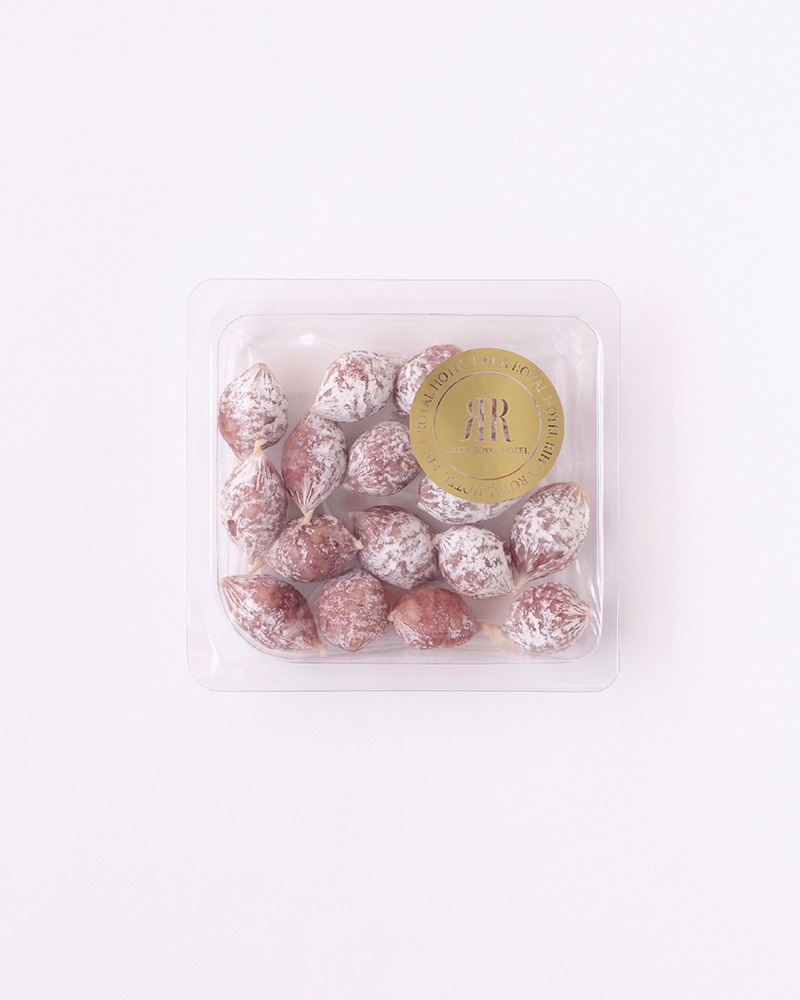 フランス産豚肉を、胡椒、メース、クローブなどの香辛料とともに塩漬けにして自然乾燥熟成させました。
