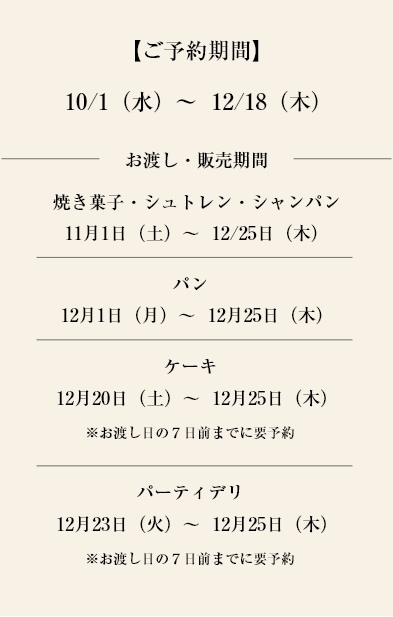 クリスマスシーズンに欠かせないドイツの伝統的なパン。バターの風味豊かな生地に、ラム酒に約1か月間漬け込んだ香り豊かなドライフルーツとアーモンドを練り込み、焼き上げました。焼き立てより数日置き、芳醇な味わいが馴染んだ頃に、より美味しくお召しあがりいただけます。